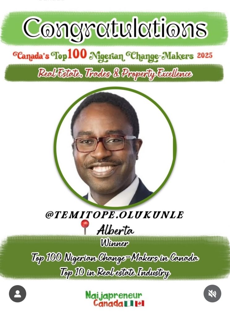 Today, we celebrate one of our own, Temitope Olukunle, on being recognized among Canada’s Top 100 Nigerian Change-Makers (2025)—and ranked Top 10 in the Real Estate Industry.