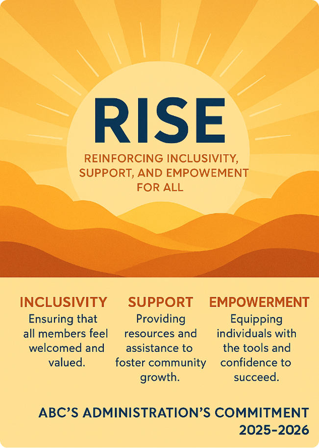 Under RISE, ABC is reaffirming its belief that collective progress is the true measure of success. Our administration recognizes that unity, transparency, and accountability are central to how we serve. By aligning every committee, initiative, and partnership with the RISE framework, we ensure that ABC remains a dynamic, resilient, and community-driven organization.
